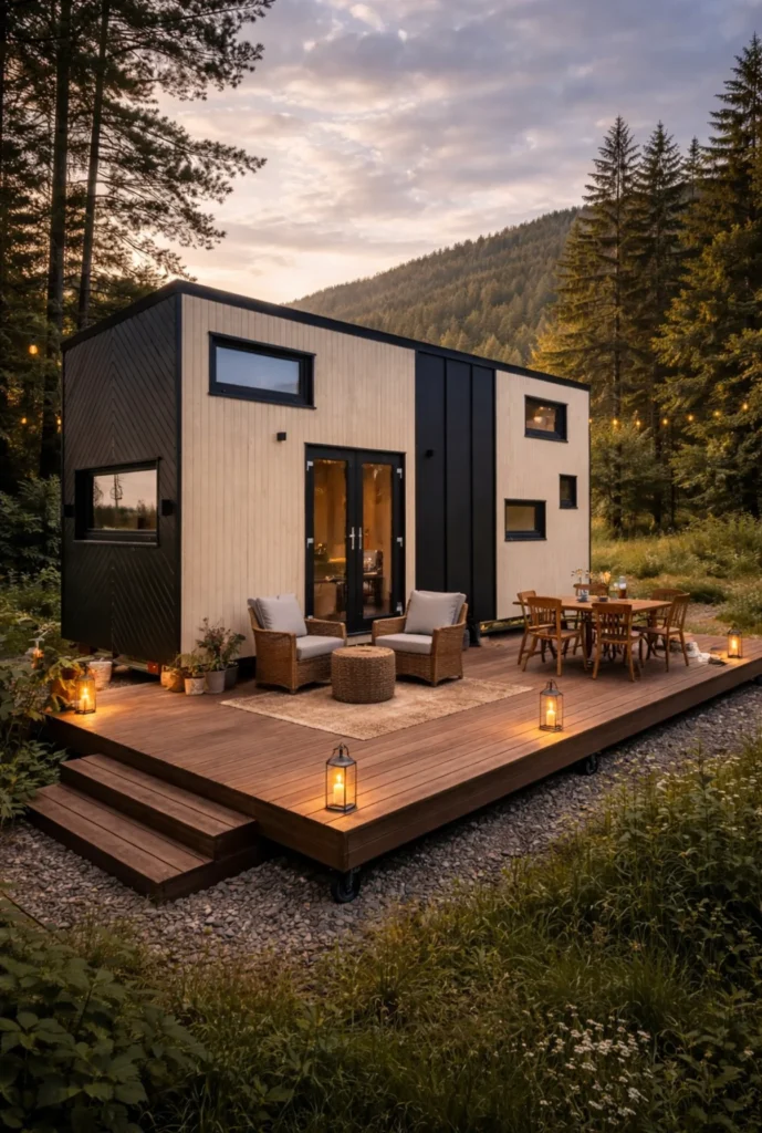 Przestronny, całoroczny tiny house mobilny z dwiema antresolami sypialnianymi, pełnym wyposażeniem kuchennym oraz klimatyzacją WiFi. Idealne rozwiązanie dla rodzin lub grup do 6 osób, łączące maksymalną przestrzeń z mobilnością.