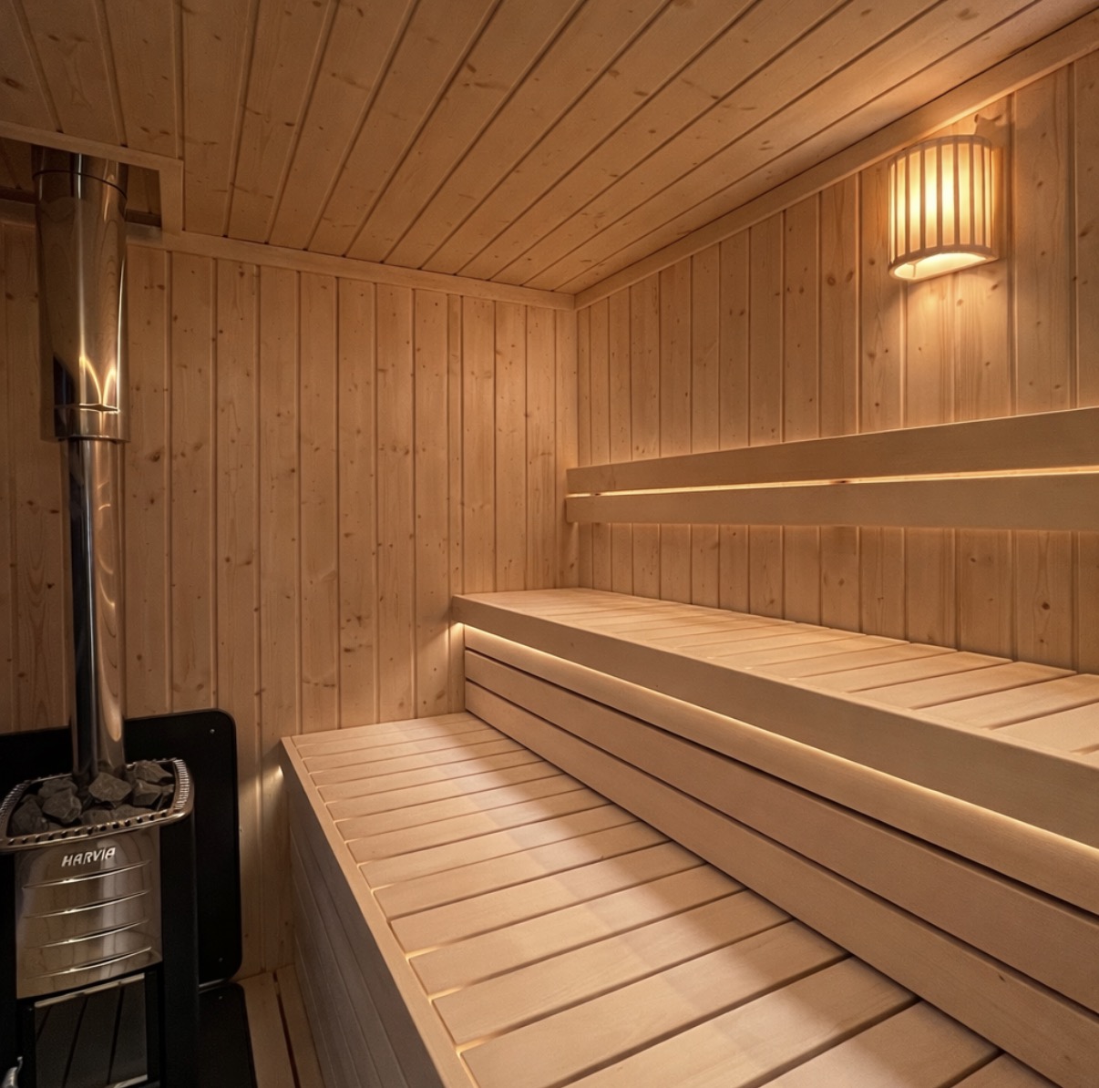Wnętrze wykończone świerkiem skandynawskim z ergonomicznymi ławkami z abachi gwarantuje komfort i przyjemne doświadczenia podczas każdej sesji saunowej. Przeszklone drzwi wpuszczają naturalne światło i pozwalają na zachowanie kontaktu wzrokowego z ogrodem.