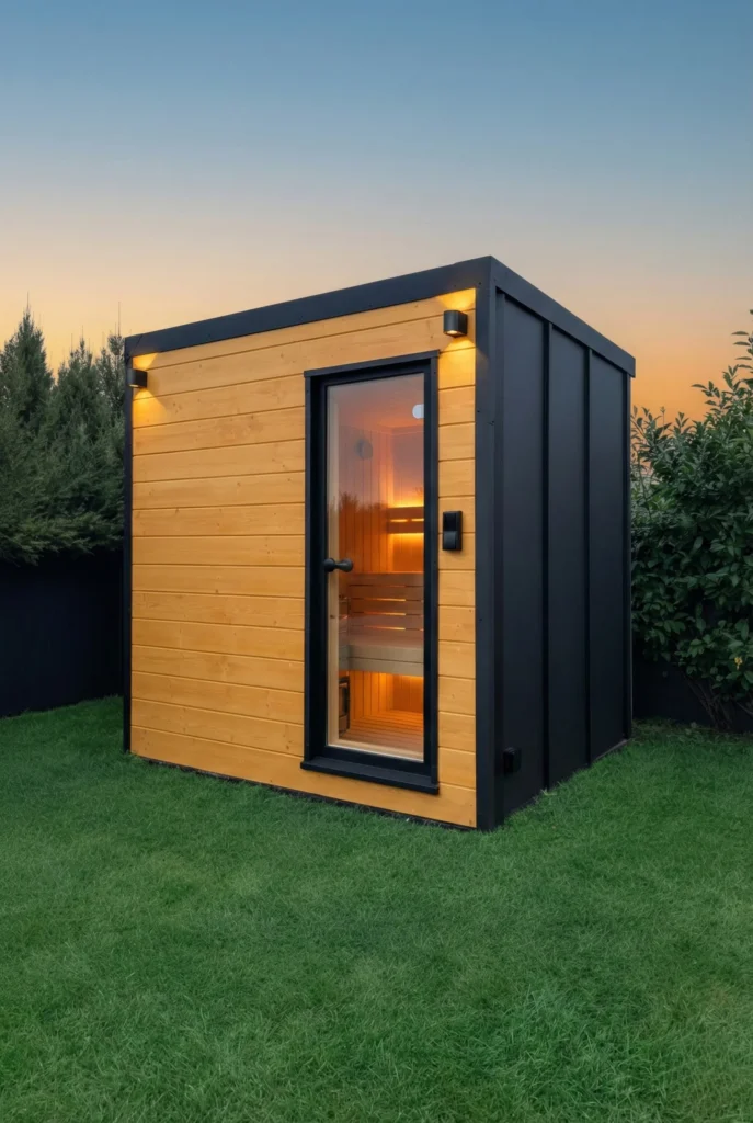 Prosta i kompaktowa sauna ogrodowa o minimalistycznej, kubicznej formie. Model zaprojektowany jako uniwersalne rozwiązanie, które sprawdzi się w każdym ogrodzie. Czysta bryła, naturalne materiały i przeszklone drzwi tworzą nowoczesny, ponadczasowy wygląd.